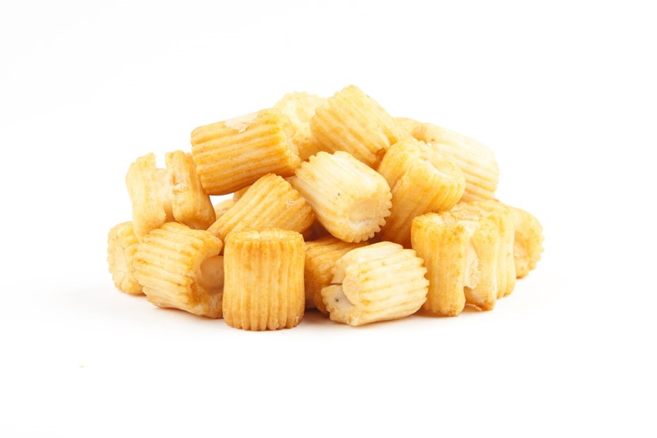 Krokant rijstcrackertje gevuld met cheddar kaas.